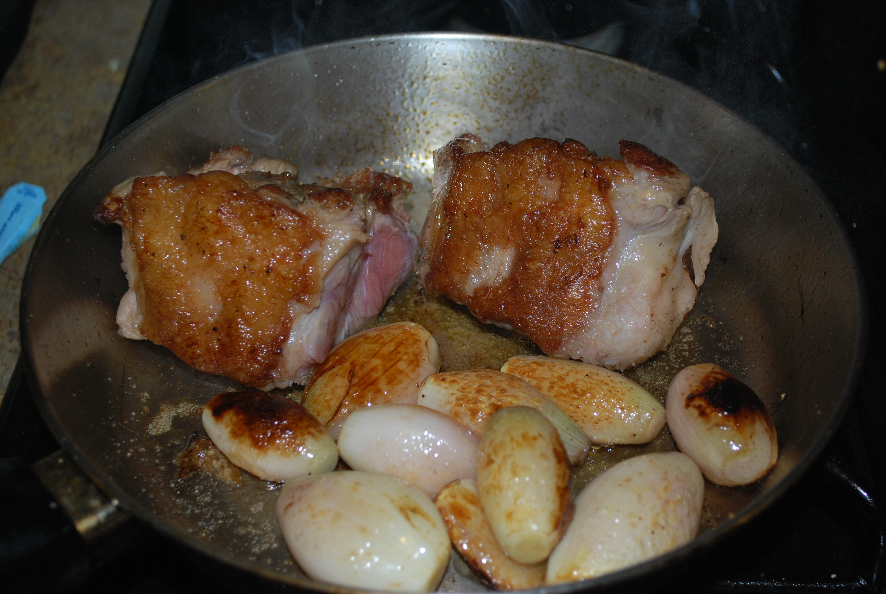 - Now we brown the chicken. Turn the pan up high, until he fat is barely smoking. You’re not going to be able to get a super hard sear like you’ve seen me do before. There is already fond (or yummy scrapin’s) in the pan from the dried meats, which is preventing full contact with the bottom of the pan. (We’ll use those later.) When the pieces are golden brown on one side, turn them, and brown them on the other. This could take about 5-7 minutes each side. When the chicken is done, shingle it in the slow cooker.