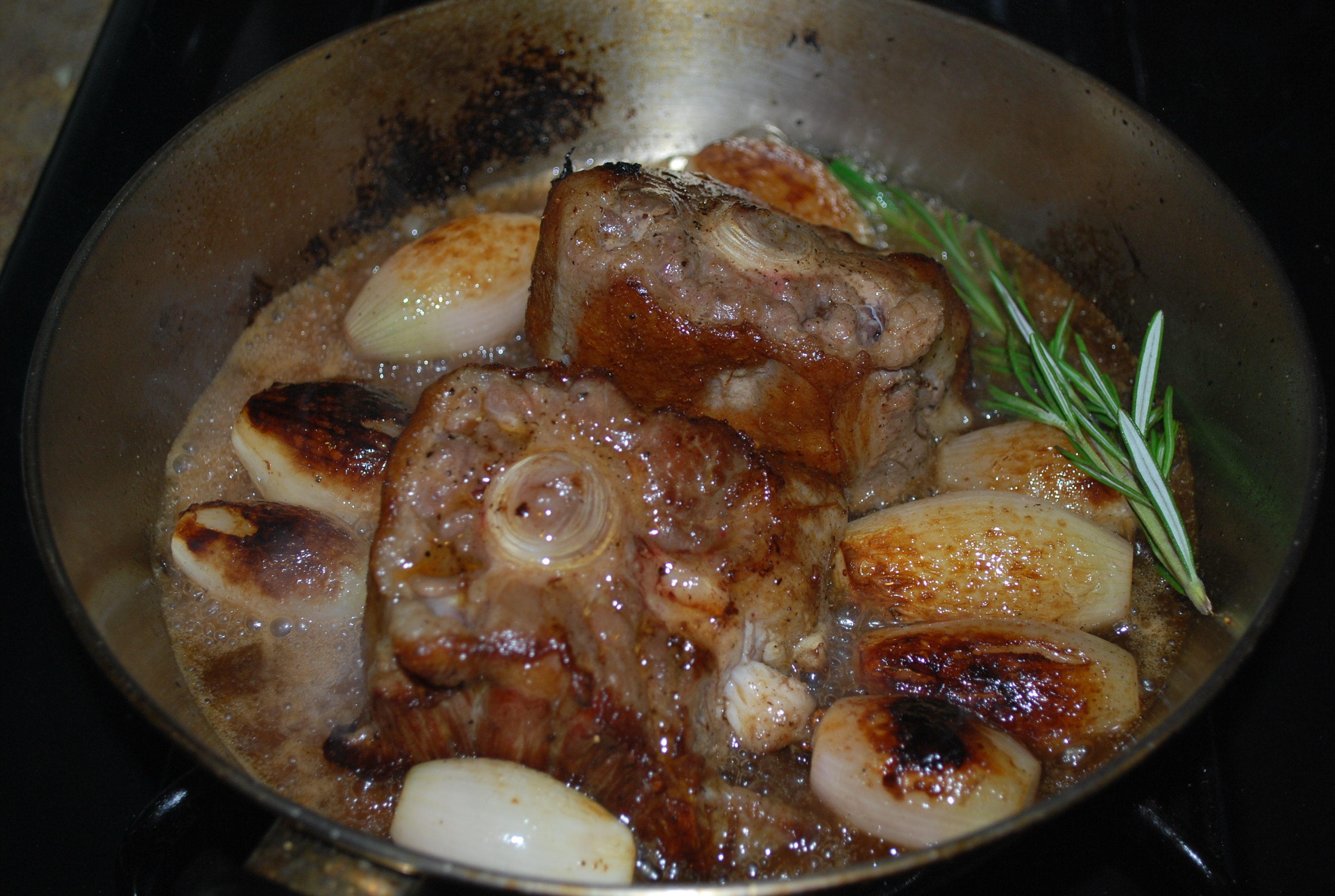 - Add the onions, garlic cloves, and peppers and sweat these out until the onions are translucent. Now add your wine. Scrape the pan again. Let the wine reduce by half.