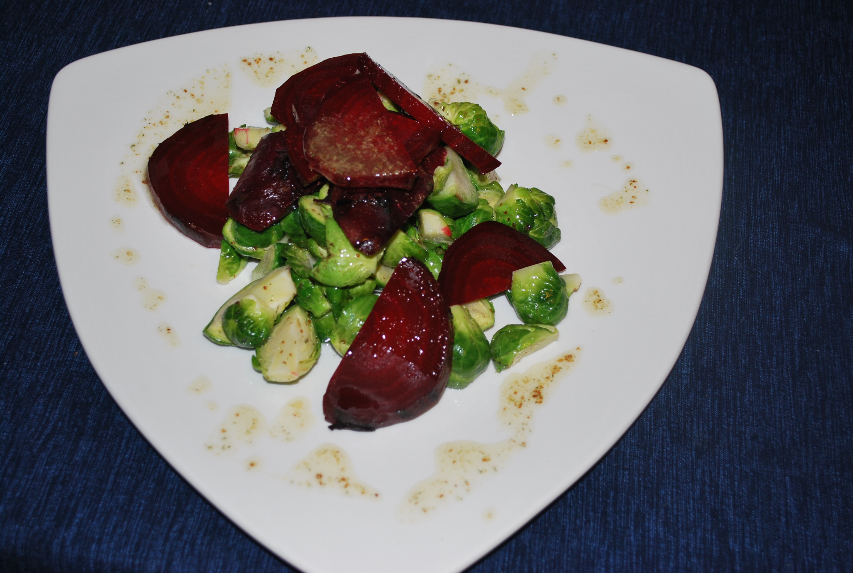 - So everything is ready, now what? Take some of the dressing and toss it in with the beets. Take some more dressing and toss in in with the sprouts. Now just plate them up.