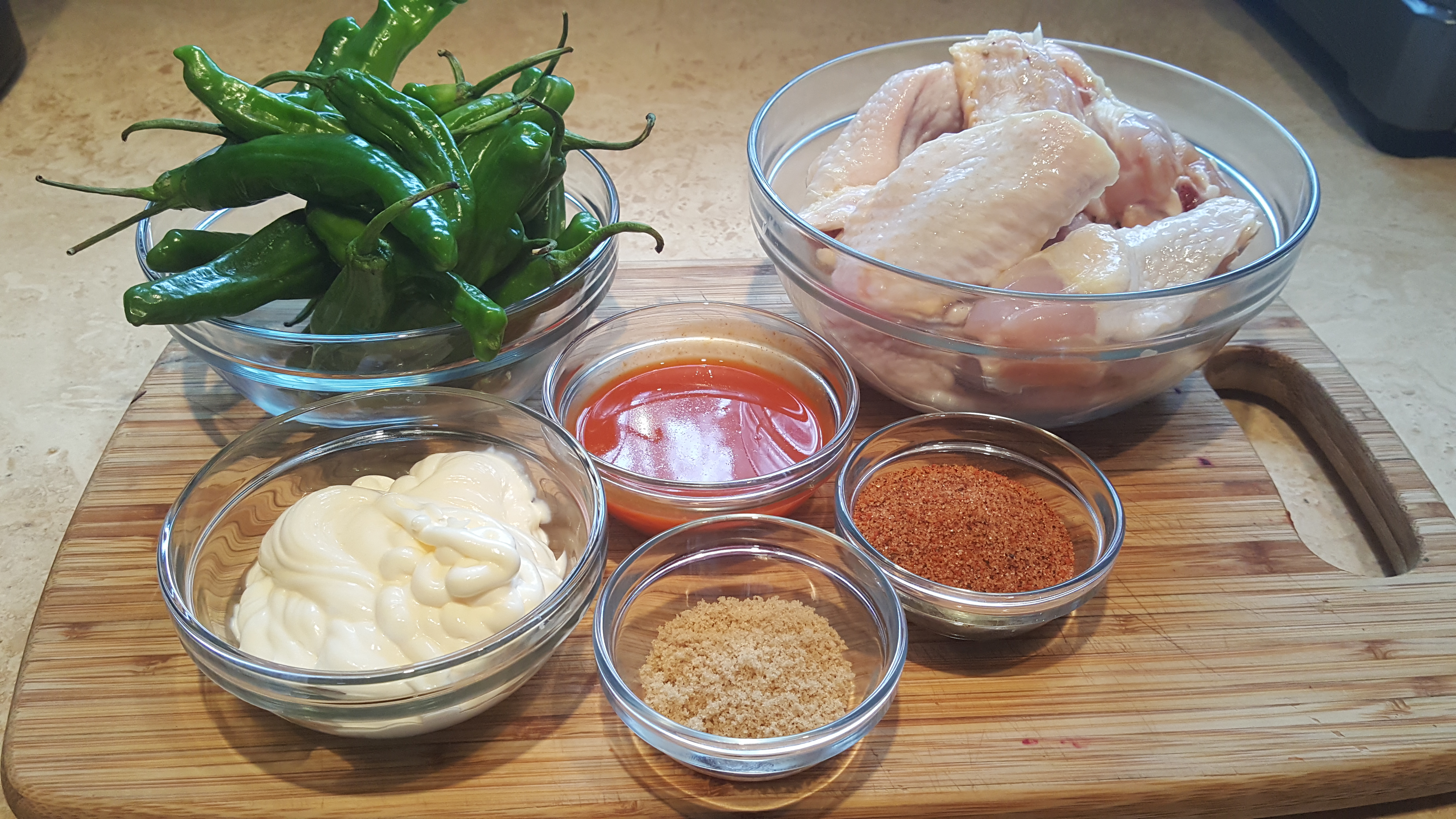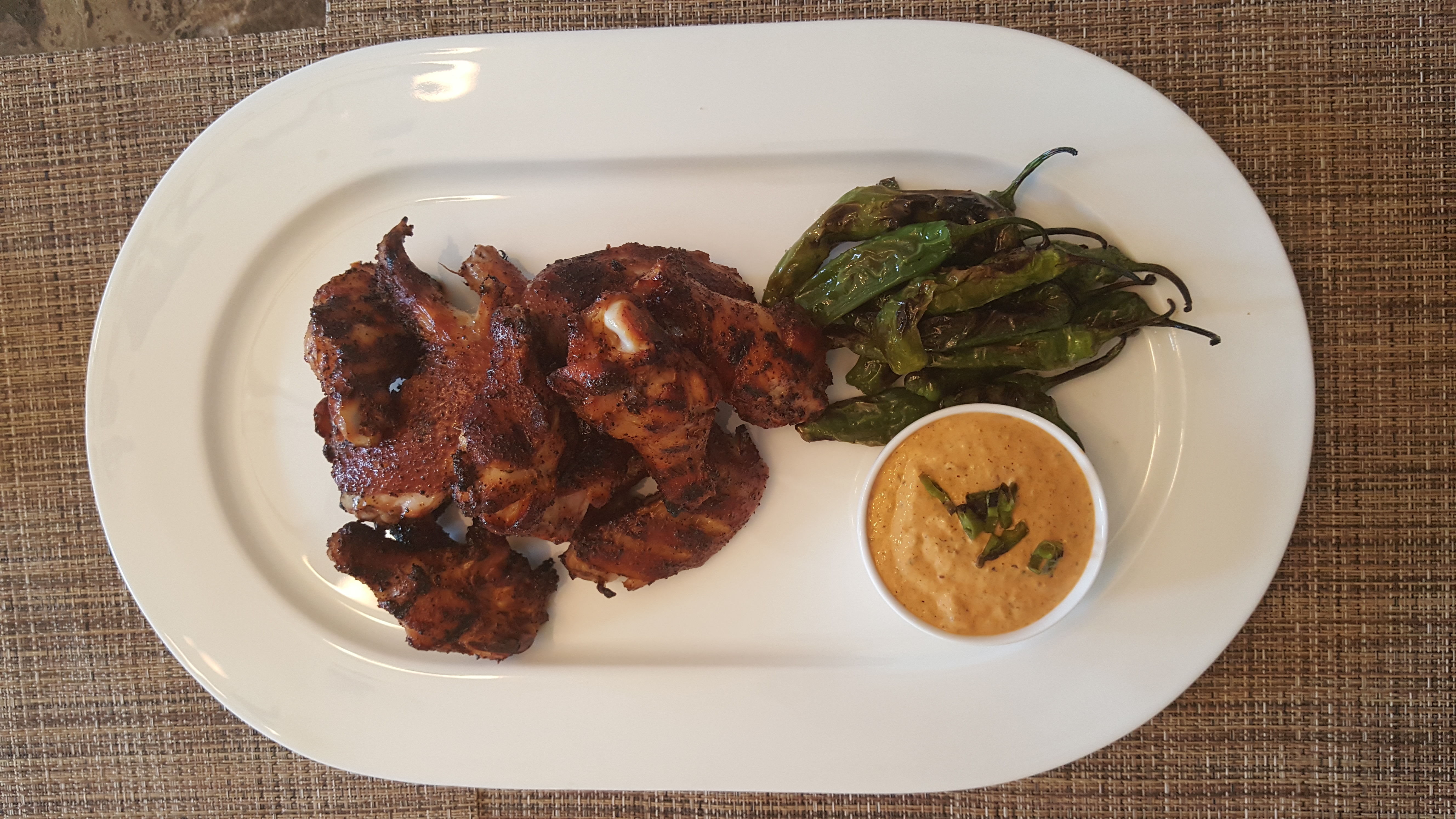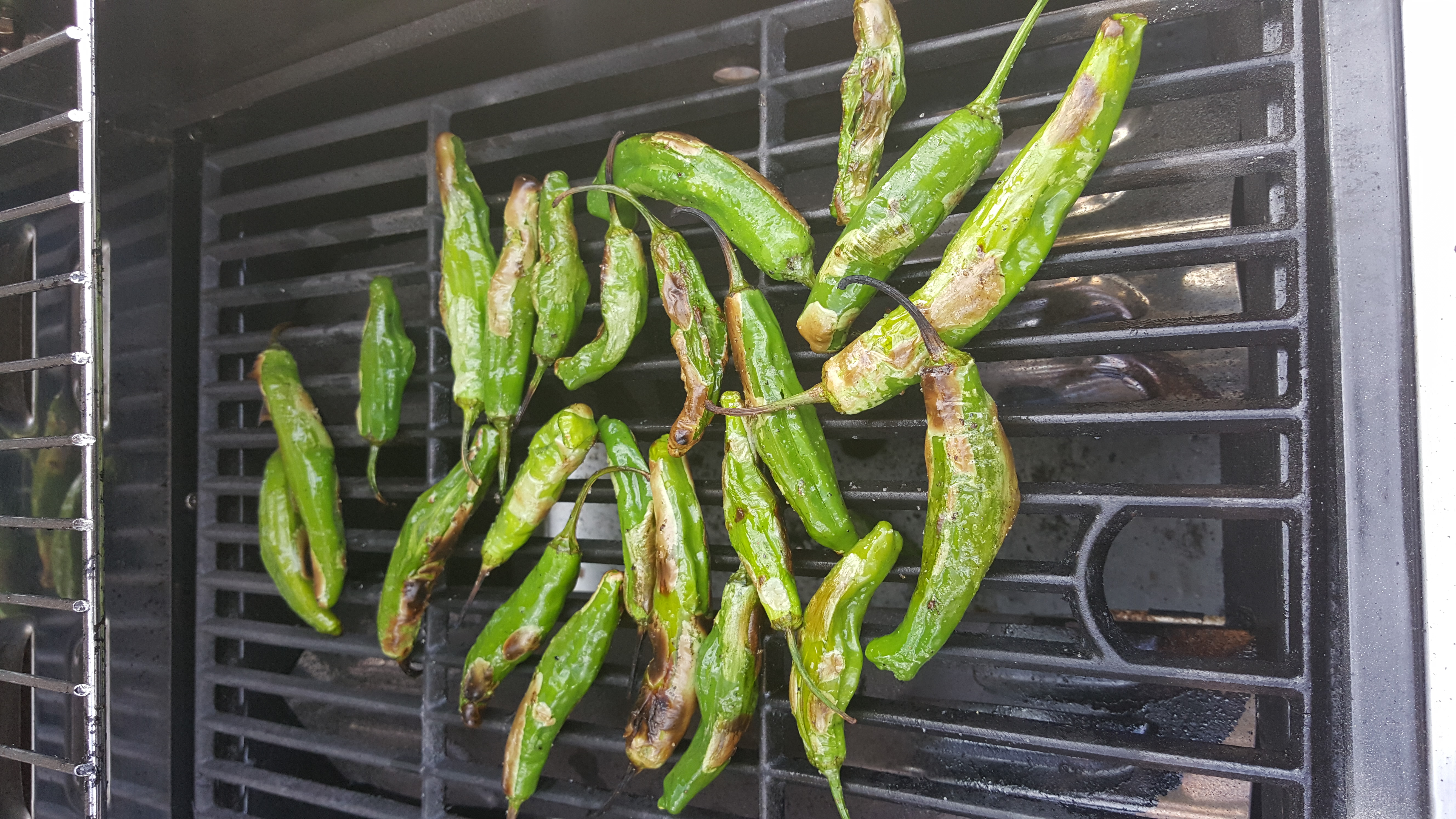 - While your wings are going, toss your shishito peppers in oil, salt and pepper and throw them down too. Let these sit about 3-5 minutes on each side. You want them to blister and char, ever though you’re not going to peel them.