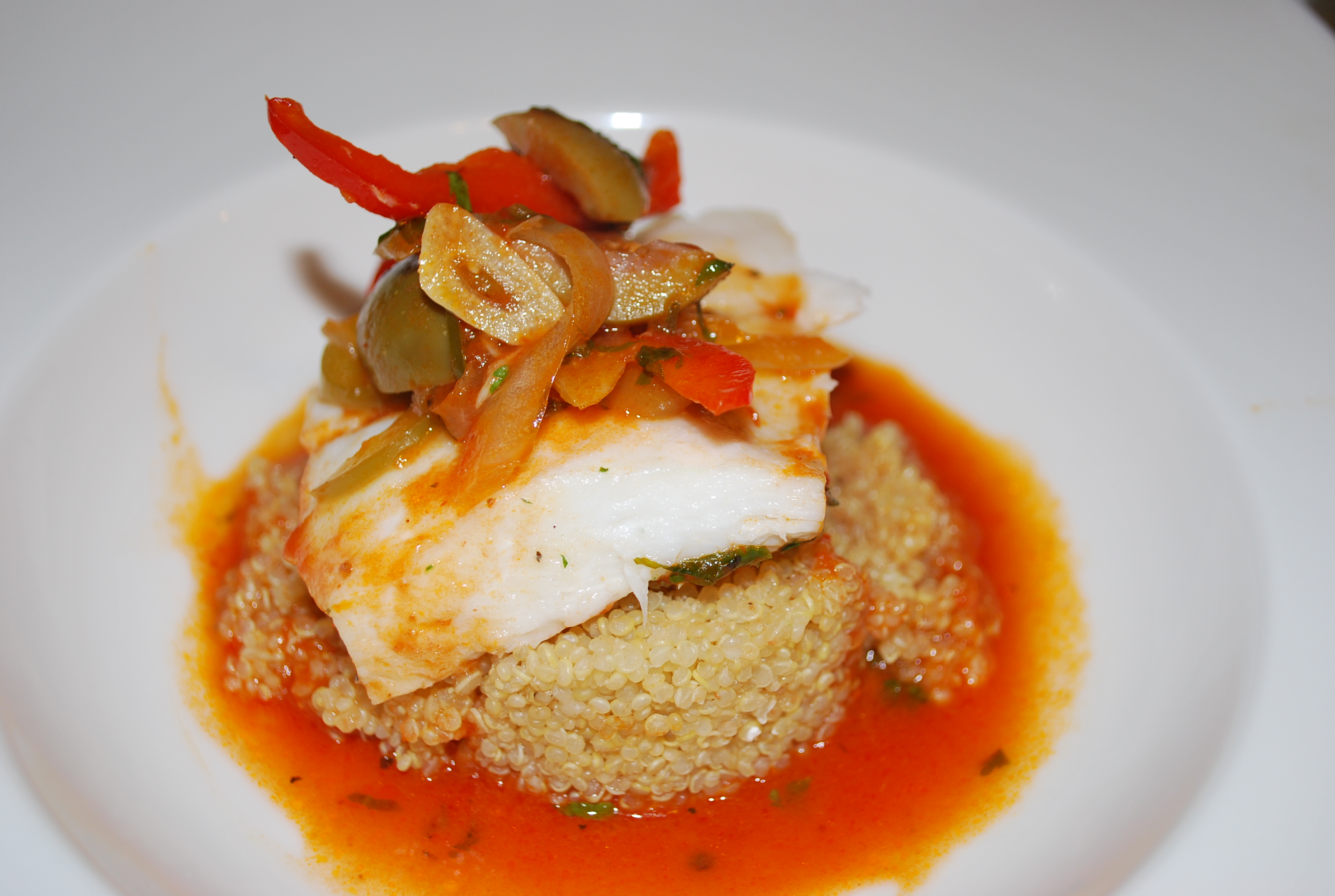 I like to server this over quinoa or some other funky grain, but the traditional accompaniment for this dish is rice. Black beans and pinto beans go well with this too. You can also use pretty much and firm white fish you like. Using something like sole is a little too delicate for this, but sub in anything you like. I like to add a coupe of jalapenos or Serrano chiles to this too for some heat. Play with it a such as you like, just be careful not to season it too much. there’s going to be a lot of salt coming out of those good olives. Don’t forget to leave a comment.
