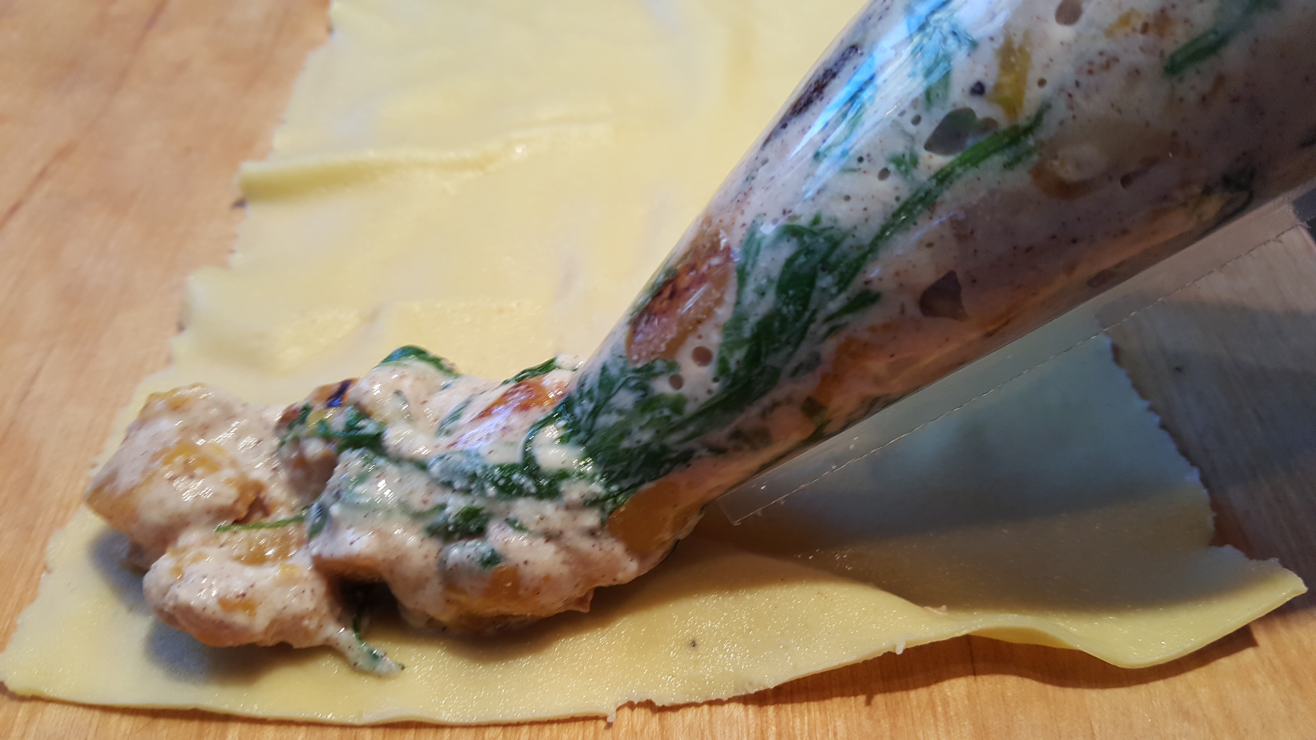 - While the squash is roasting, roll your pasta dough out to the thinnest setting. Cut itinto 18″ to 24″ lengths. Blanch the pasta dough in the boiling water. After 1 minute, drop the pasta sheets into an ice bath and remove them after about 5 seconds. Lay the sheets out between oiled parchment until you’re ready to use them.